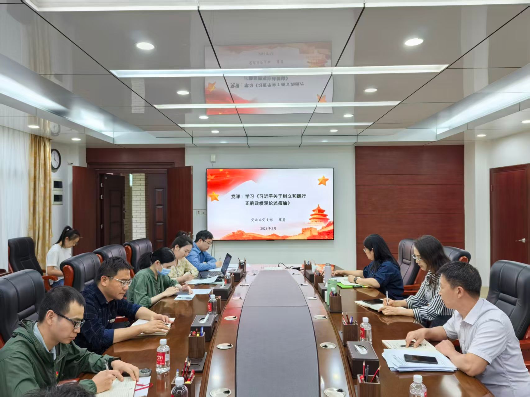 近日,党政办公室党支部举行专题党课,围绕“树立和践行正确政绩观”主题展开深入学习。党支部书记廖勇以《习近平关于树立和践行正确政绩观论述摘编》为核心教材,结合党政办公室工作实际,从正确政绩观的时代内涵、重要意义以及如何在日常工作中践行等方面进行了系统阐述。他指出,政绩观是党员干部党性修养、宗旨意识、发展理念的集中体现,关乎立党为公、执政为民。一要准确把握“为民造福是最大政绩”的价值追求,以“功成不必在我”的精神境界和“功成必定有我”的历史担当,求真务实、真抓实干。二要聚焦主责主业,立足党政办公室作为学校“参谋部”“指挥部”“第一窗口”的核心定位,把正确政绩观落实到具体工作中,在参谋服务上求“深”,在统筹协调上求“畅”,在服务保障上求“优”。三要锻造过硬队伍,强化党性修养、提升能力本领、弘扬务实作风、严守纪律规矩,做政治上的明白人、业务上的内行人、落实上的实干人、廉洁上的干净人。